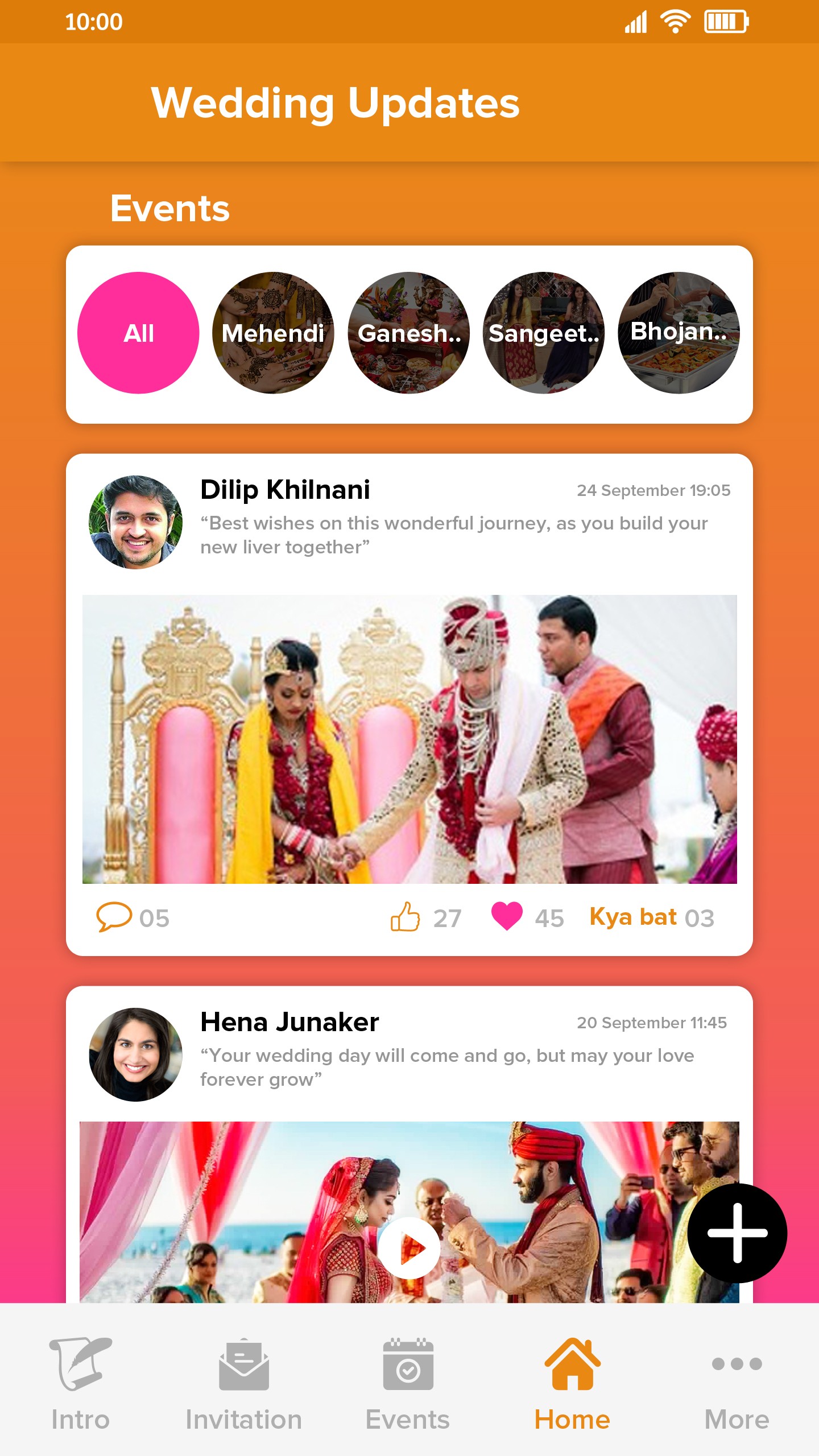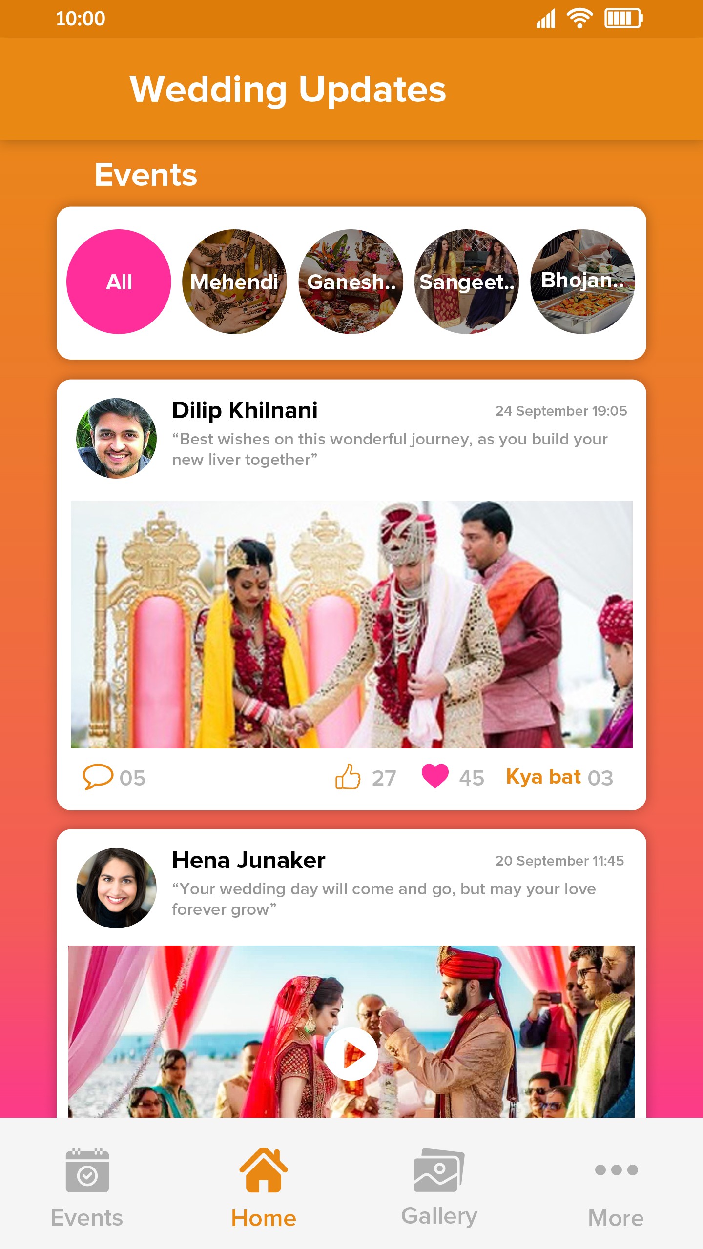 The app opens to a vibrant digital courtyard—the Home Screen. It's a private social wall where the pre-wedding buzz begins. Guests see glimpses of dance practices, shopping sprees, and excited chatter, building momentum long before the main events.