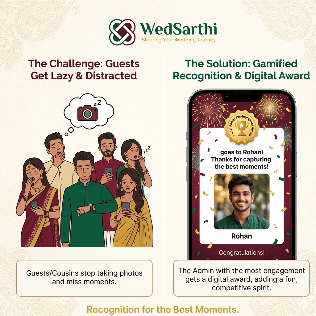 To keep the Sarthis motivated, the app tracks engagement. At the final event, a digital award is announced for the 'Best Family Photographer'—the admin whose posts got the most love—adding a fun, competitive spirit to capturing memories.