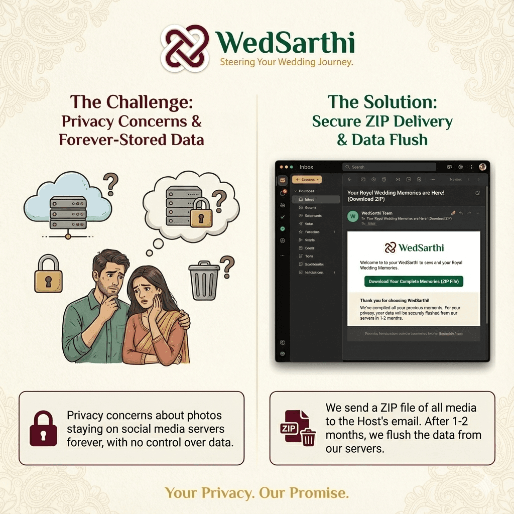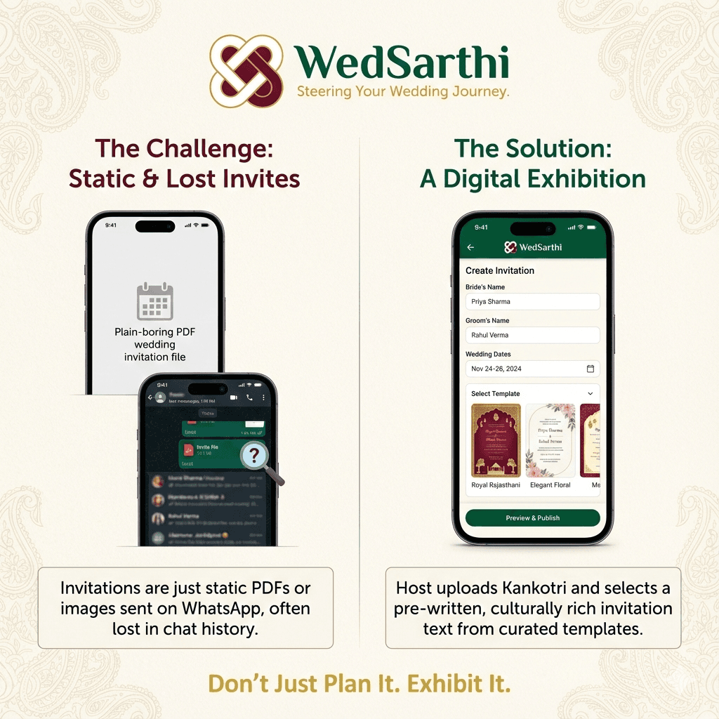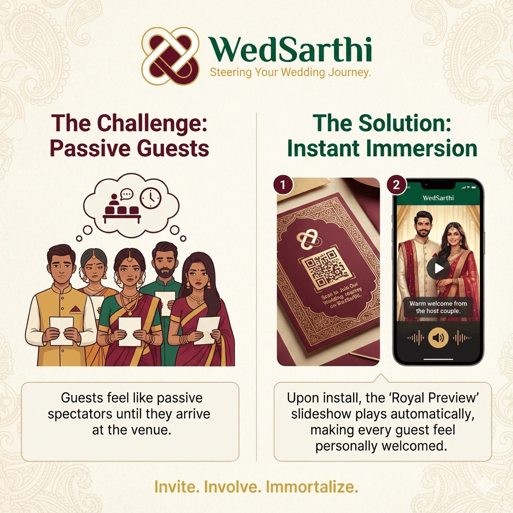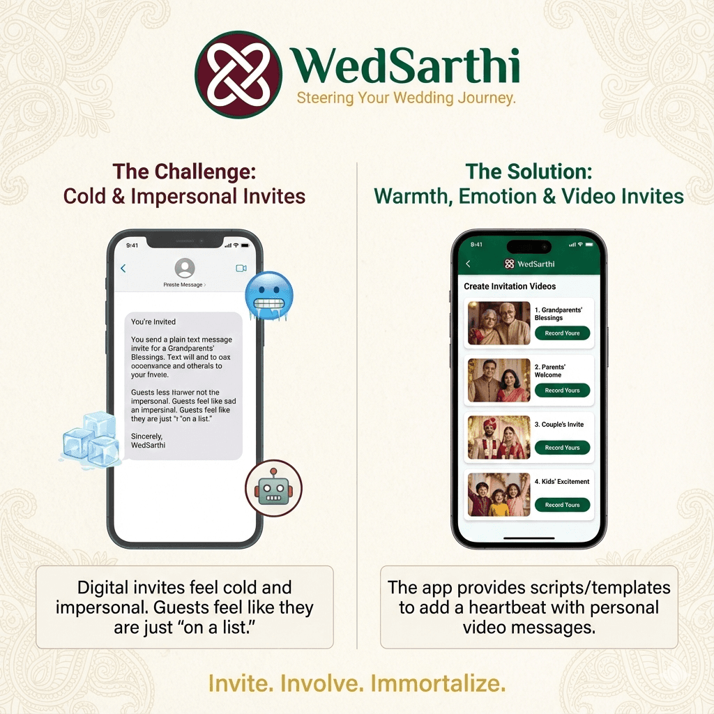 Move beyond static text. You add a heartbeat to your invite with personal video messages from the pillars of your family—parents, grandparents, and the couple themselves. WedSarthi provides the script; you provide the emotion.