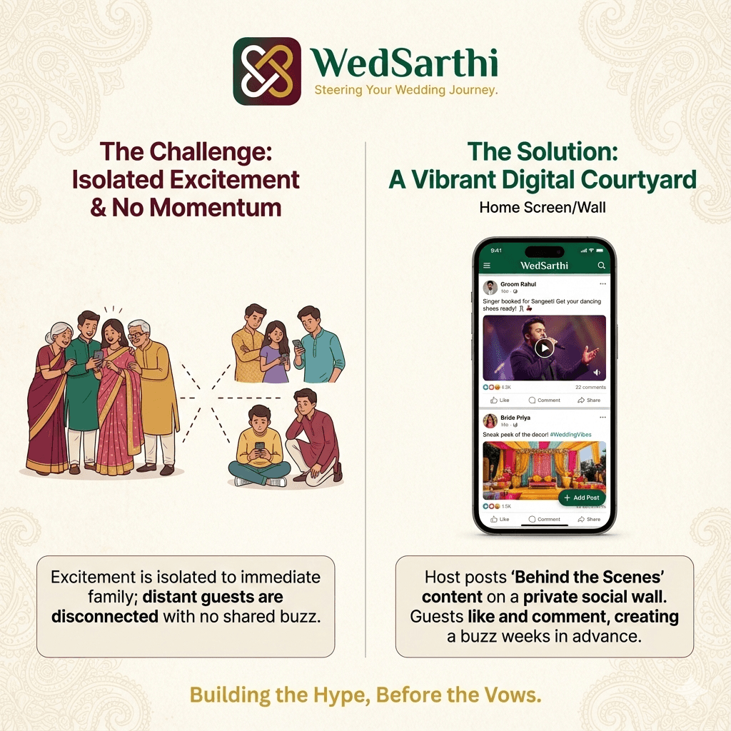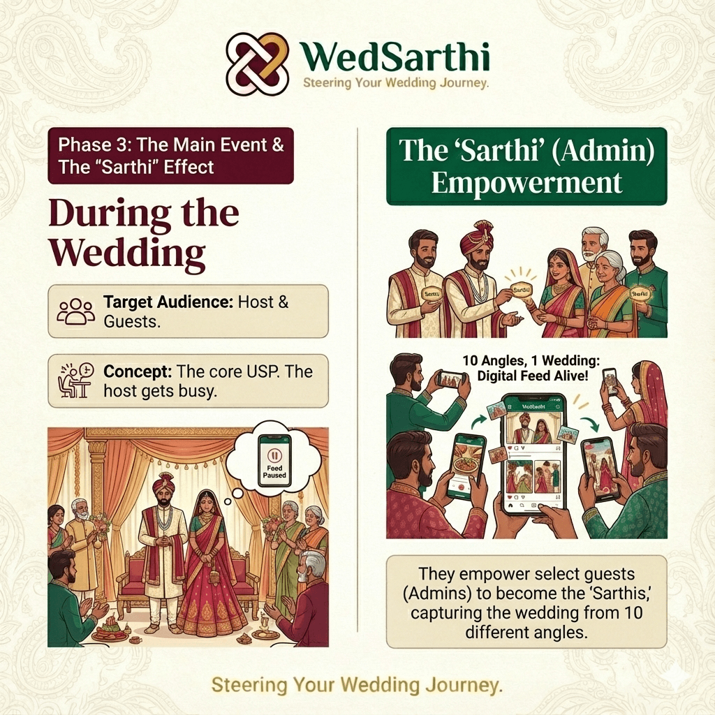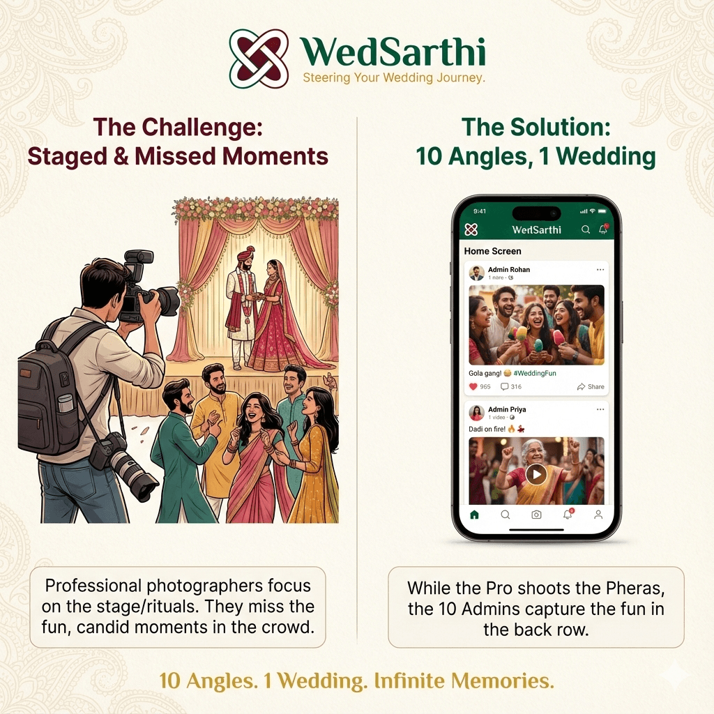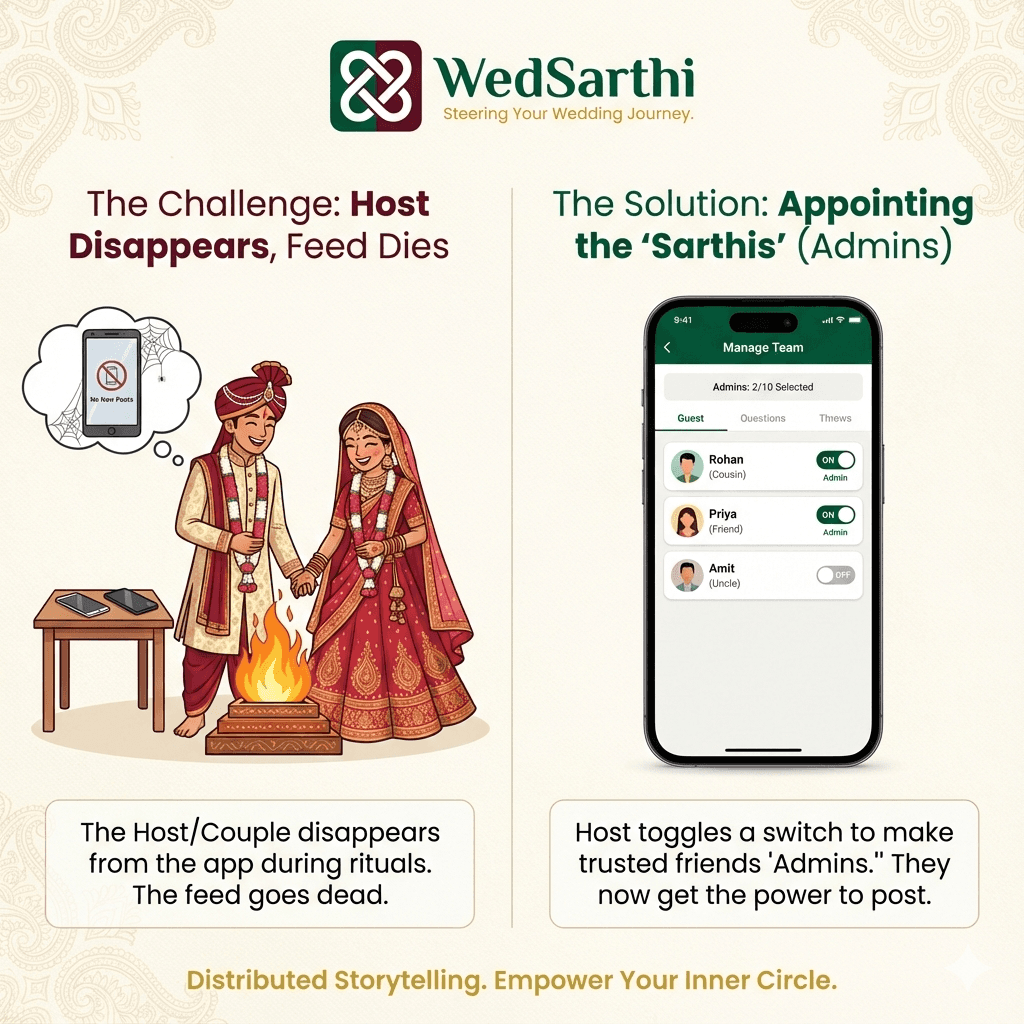 The core USP. The host gets busy, so they empower select guests (Admins) to become the "Sarthis," capturing the wedding from 10 different angles and keeping the digital feed alive.