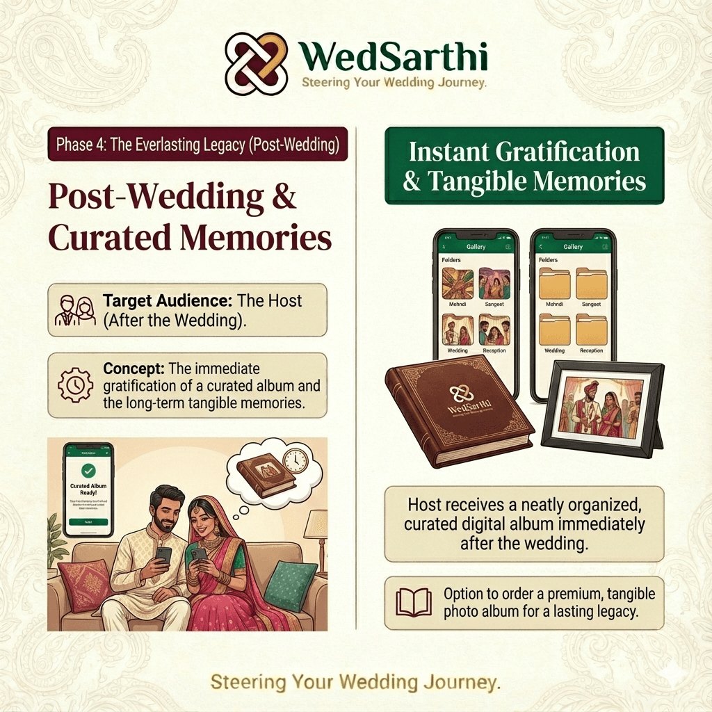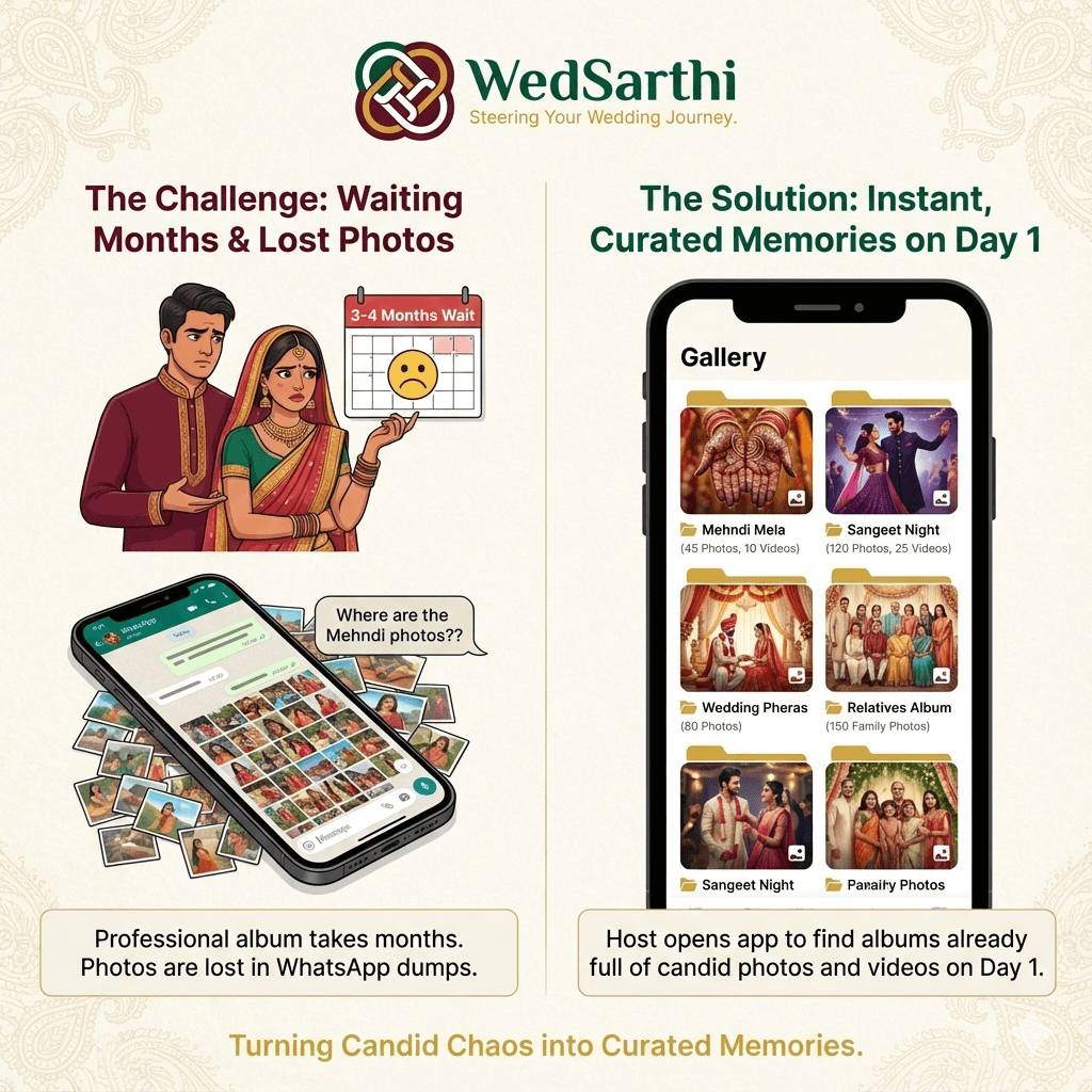 The morning after the wedding, while others wait months for photos, you wake up to a treasure trove. The WedSarthi gallery is already organized, with every candid moment categorized into albums like 'Mehndi,' 'Sangeet,' and 'Relatives'.