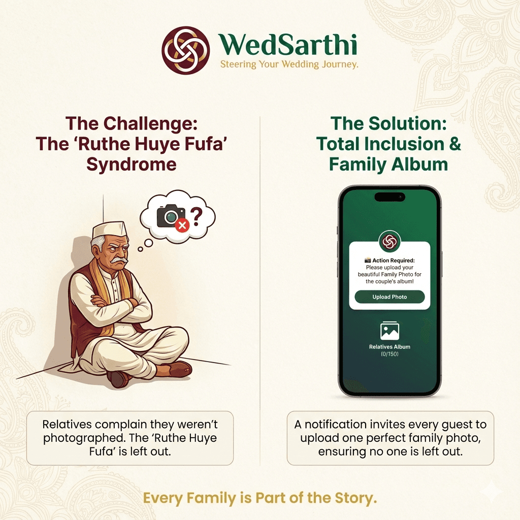 Every family is part of your story. A special notification invites every guest to upload one perfect family photo, ensuring no "ruthe huye fufa" (upset relative) is left out of the final memories.