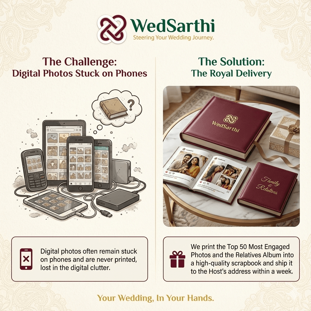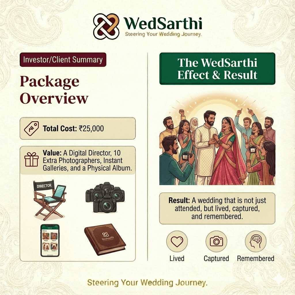 Total Cost: ₹25,000 Value: A Digital Director, 10 Extra Photographers, Instant Galleries, and a Physical Album. Result: A wedding that is not just attended, but lived, captured, and remembered.