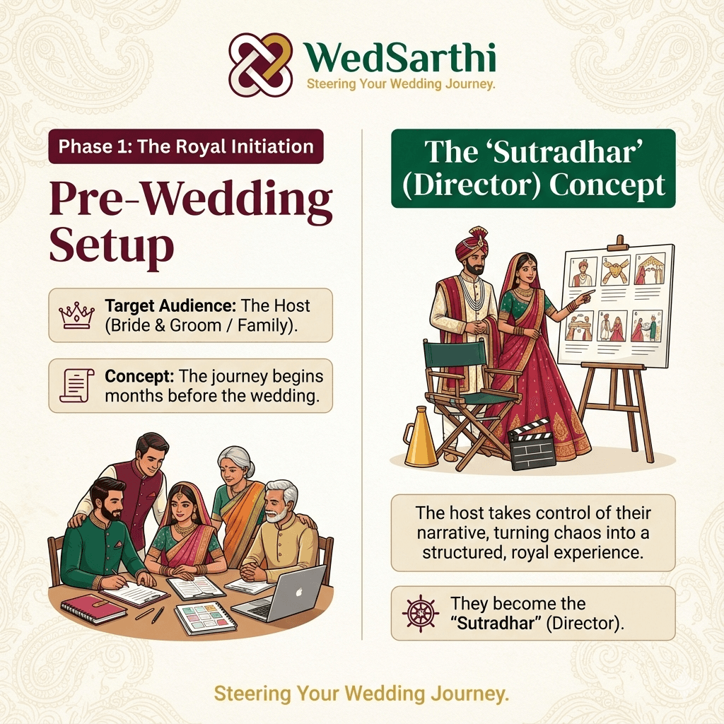 The journey begins months before the wedding. The host takes control of their narrative, turning chaos into a structured, royal experience. They become the 'Sutradhar' (Director).